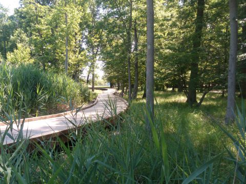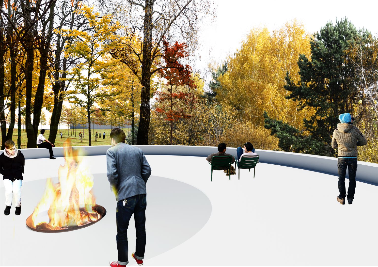 Premier élément favorisant une occupation collective du site : une plate-forme circulaire en béton architectonique installée dans le sens de la topographie et des cheminements est située au cœur d'un très beau paysage de marais, à proximité des terrains de base-ball. Son emplacement précis permet de faire lieu en plein vide. Espace de liaison et de partage à double orientation, ce mobilier s'adresse au bois existant comme aux bâtiments du campus. La position et l’orientation de ce dispositif révèlent et organisent l’espace ouvert. Elles donnent la conscience de l'espace, la conscience d’une situation. Ancrée dans le sol, cette pièce de mobilier horizontal dont l'artificialité est pleinement assumée présente différents cercles d'usages, de l'extérieur vers l'intérieur : espaces d'assises, de discussion, de repas, de chauffage ou de cuisson autour d'un feu. Chaque module en béton formant cet ensemble est suffisamment massif pour s'imposer sans timidité sur le site, et faire face à l’échelle du territoire. Dans cette même optique, le cheminement surélevé en platelage bois destiné à traverser la zone humide a été imaginé dans son pouvoir de présence. Il renvoie à un imaginaire de stabilité et de robustesse, une attention importante pour exister dans un territoire aussi rude. Et si le sentiment de solidité prédomine en vue rapprochée, il disparaît aussitôt en vue lointaine : les lignes de force du traitement des chemins se confondent alors avec le paysage. Des éléments d'assises sont intégrés aux barrières afin d'offrir des moments de pause informelle au cours de la promenade sans pour autant l'interrompre.