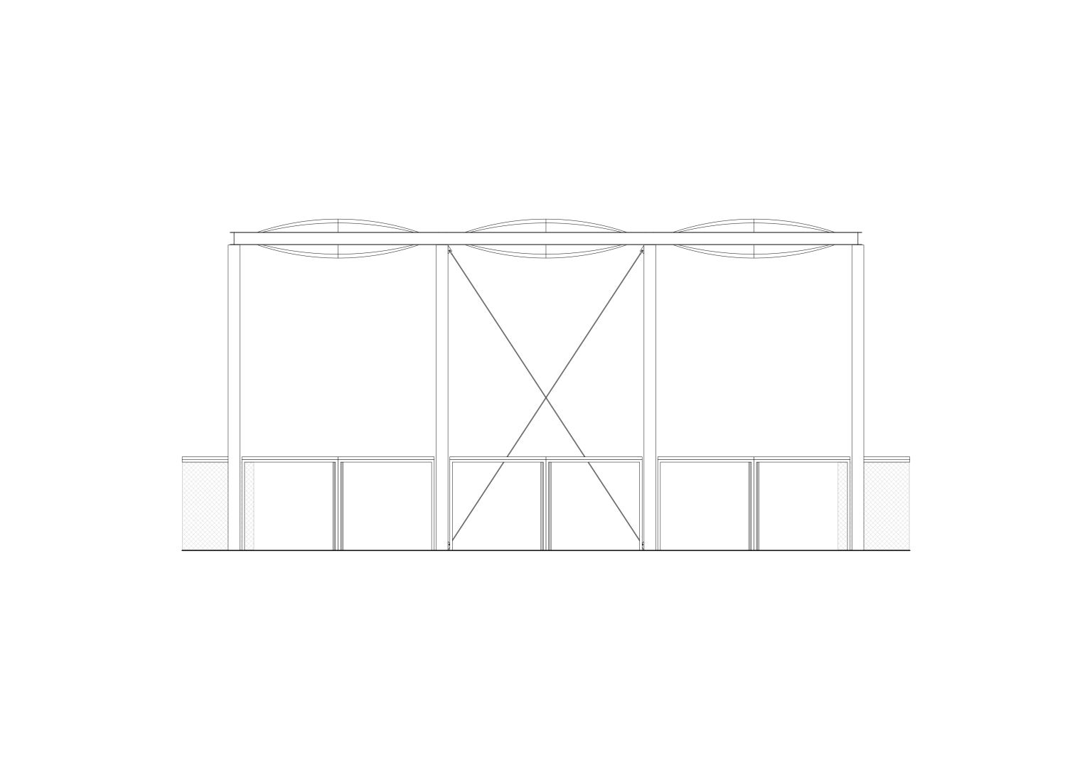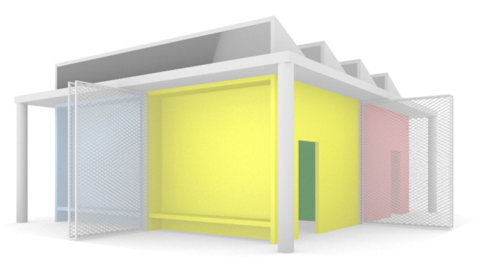 Les vestiaires-sanitaires : Les vestiaires-sanitaires est situé proches du terrain de baseball. Comme pour le local de stockage, son ossature extérieure est un système poutre poteaux en acier galvanisé. En second plan, des panneaux en bois colorés délimitent les différents locaux. Les couleurs permettent, d’identifier les différents espaces – homme /femmes, sanitaire/vestiaires. La toiture en shed diffuse de la lumière naturelle.