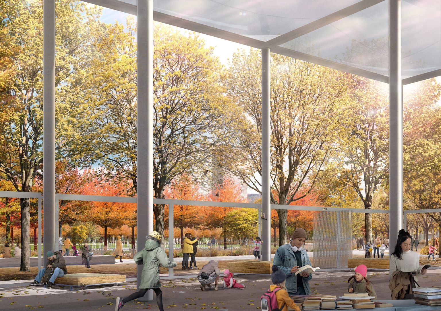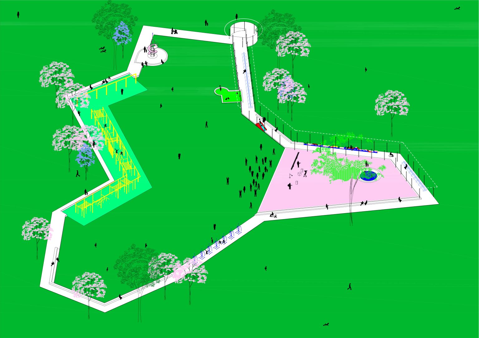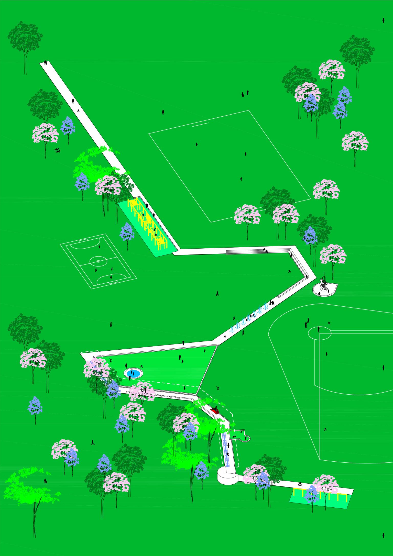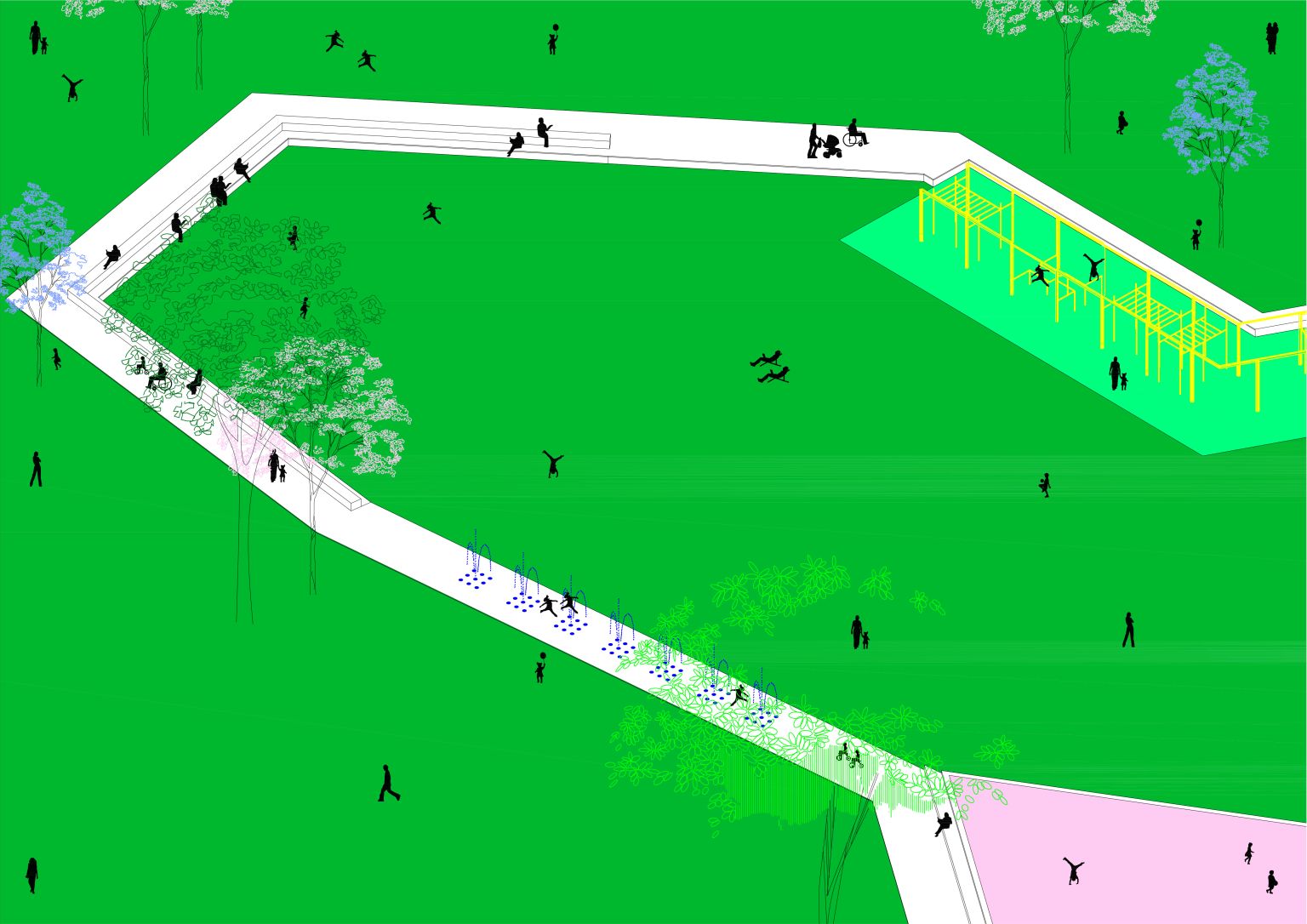 Des équipementss jalonnent le parc - halle, édicules, agrès, bancs - ils accompagnent les formes rayonnantes en soulignant la grande clairière. Une halle de grande hauteur marque l’entrée sur l’avenue de l’Europe pour y accueillir des évènements à l’échelle de la ville. Les édicule, caractérisés individuelement, présentent ensemble une cohérence architecturale par leur système constructif et leurs proportions. Les couleurs pastel des édicules - jaune, bleu, rose et vert - rappellent la palette chromatique du centre-ville.