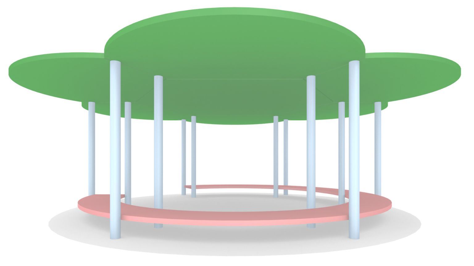 Kiosque : Le kiosque propose de l’ombre et un espace convivial. Une grande banquette encercle l’édicule. Elle permet de s’installer vers l’intérieur ou vers l’extérieur. La structure poutre poteaux est en acier galvanisé. La toiture en corolle est débordante.